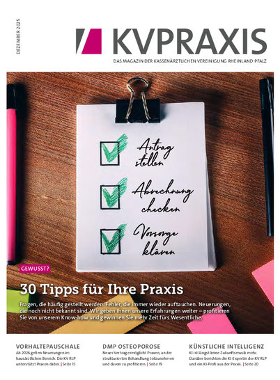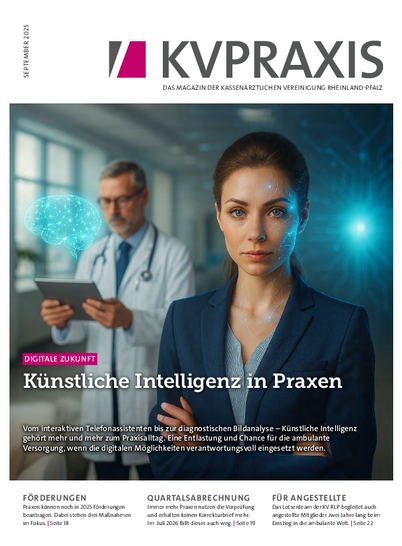 Viermal im Jahr erscheint das Magazin der KV RLP für Mitglieder: KV PRAXIS – mit dem Innenteil KV KOMPAKT, der die wichtigsten Mitteilungen für die Praxis enthält.